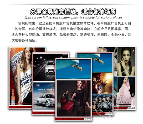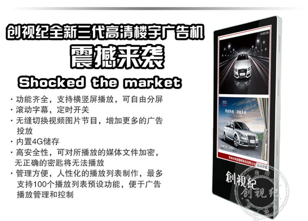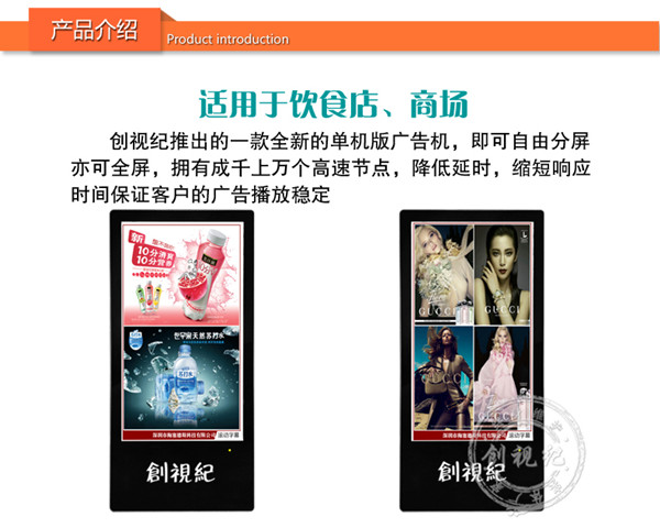 對比性 | 看家本領(lǐng): ★成本低,能滿(mǎn)足常規的廣告機播放功能; ★高清1080P視頻、圖片播放; ★一鍵拷貝節目、支持 HDMI接口輸入,可當顯示器之用。不足之處:豎屏片源需要第三方軟件制作、剪輯。分屏制作繁瑣。 | 看家本領(lǐng): ★解決客戶(hù)橫豎屏轉換問(wèn)題,可自動(dòng)對應機器旋轉視頻; ★內置4G內存,烤貝快、播放穩定、永不卡殼; ★真正客戶(hù)自由分屏,真正的實(shí)現視頻,圖片,字幕,日期的隨機組合;想怎么分就怎么分; ★目前唯一能真正實(shí)現節目之間的無(wú)縫切換的方案; ★疊加背景圖片,使畫(huà)面更美觀(guān); ★雙芯片、真正1080P的全高清解碼;目前只有我們和分眾傳媒使用此方案。 | 看家本領(lǐng): ★遠程控制、管理、下發(fā)節目; ★兼容更多格式,天氣預報等,內容豐富,操作so easy! ★后臺軟件功能強大,關(guān)鍵點(diǎn)是穩定,支持同時(shí)上萬(wàn)終端在線(xiàn); ★隨機搭配服務(wù)器安裝軟件; ★擴展性強、可安裝任意APP,滿(mǎn)足你的任何任性; ★支持阿里云服務(wù)器,強大的技術(shù)支持。真正的廣告媒體運營(yíng)最佳選擇,穩定壓到一切。不足之處:暫時(shí)沒(méi)有(這個(gè)可以有,這個(gè)真沒(méi)有...) |