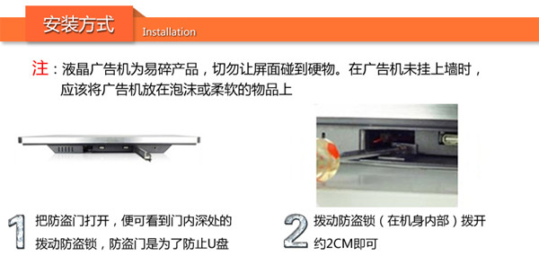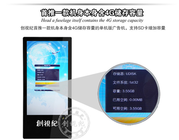 控制方式 | 通過(guò)U盤(pán),SD卡播放播放 | 通過(guò)U盤(pán),SD卡更新節目,直接將內容導入機器內存,(內置4G 內存)優(yōu)點(diǎn):客戶(hù)無(wú)需另配內存卡;拷貝速度快 | 通過(guò)電腦用網(wǎng)絡(luò )(支持有線(xiàn),wifi,可選3G)連接廣告機,電腦后臺統一遠程控制、管理 |