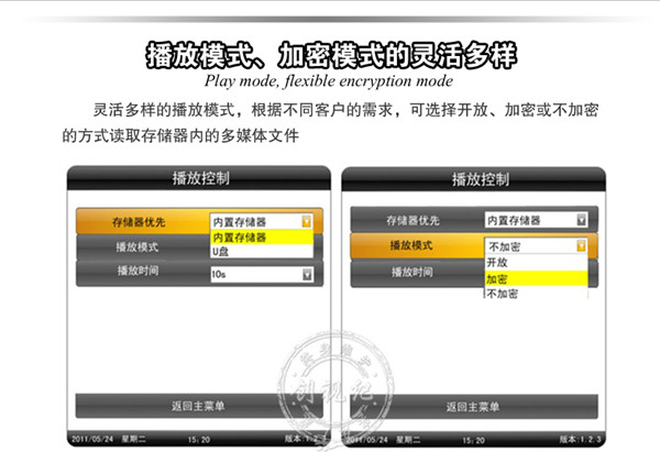 支持格式 | 視頻:MPG,AVI,RMVB,MOV,MP4,RM,TS等;圖片:JPG,BMP,PNG等;音樂(lè ):mp3;支持1920X1080高清視頻解碼。 | 支持:圖片、視頻、文本office文檔、Flash動(dòng)畫(huà)、網(wǎng)頁(yè)、天氣預報、網(wǎng)絡(luò )電視...... | |