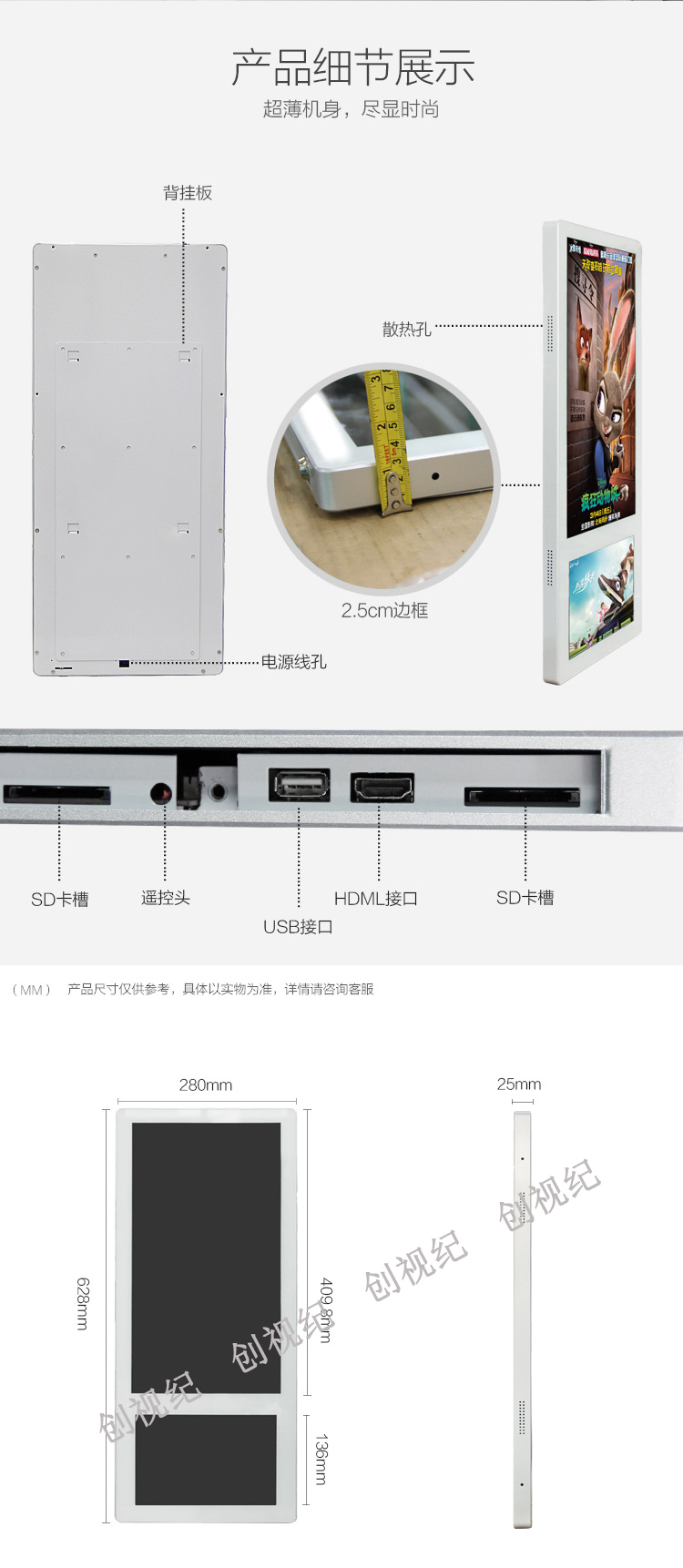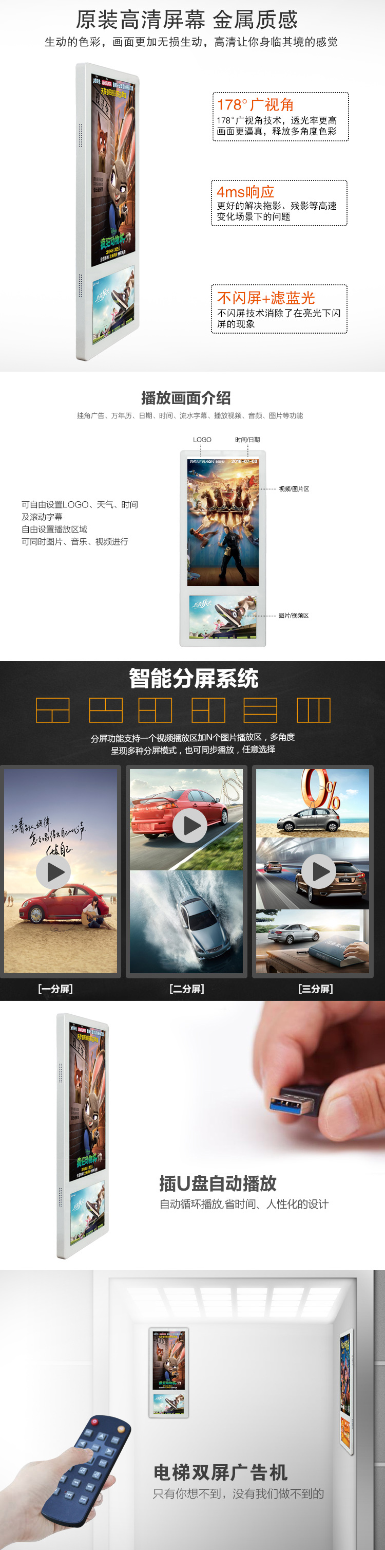 時(shí)下作為電梯傳播的媒介廣告機(jī),這些年也出過(guò)超薄系列,但是無(wú)論是古老的電梯框架,還是傳統(tǒng)的蘋果款,亦或是超薄單屏,都無(wú)法給消費(fèi)者,投資者帶來(lái)新穎的視覺沖擊的效果,新潮傳媒做了大膽嘗試,進(jìn)而選擇我們創(chuàng)視紀(jì)作為他們的供應(yīng)商之一,我們作為工廠的生產(chǎn)著也為之自豪,機(jī)器采用型材設(shè)計(jì),總厚度控制在2.5公分,18.5寸大屏加10.1寸小屏的結(jié)合,不僅可以讓投資者多一份收入,還能讓廣告商更多一份選擇。