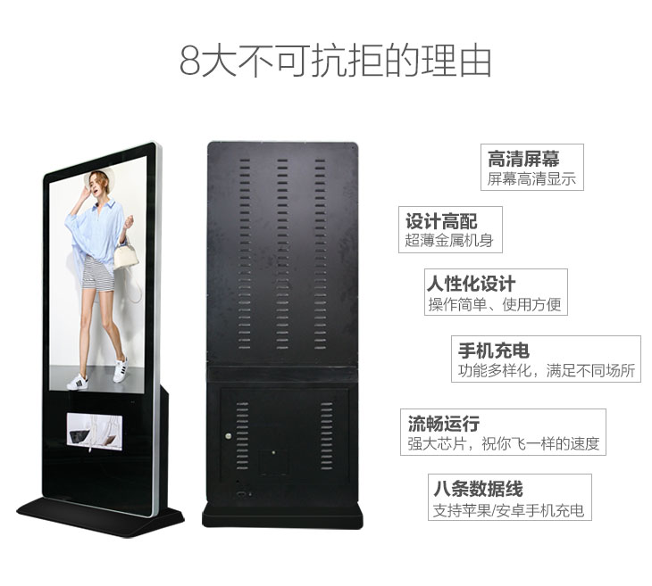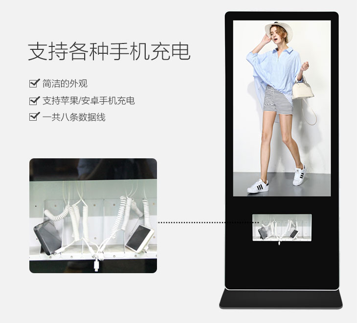 隨著當今社會的發(fā)展,手機是人們不可缺少的通信和社交的電子產(chǎn)品,現(xiàn)創(chuàng)視紀推出一款立式有線充電廣告機,支持多種型號手機接口充電(蘋果、安卓、華為),共有8條數(shù)據(jù)線,可同時充電,無需等待,操作簡單,使用方便,給外出者臨時充電的提供了便捷的服務,廣告機圖片和視頻可自主更換,高清顯示,廠家直銷,尺寸均可定制,歡迎前來選購