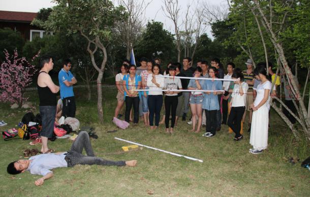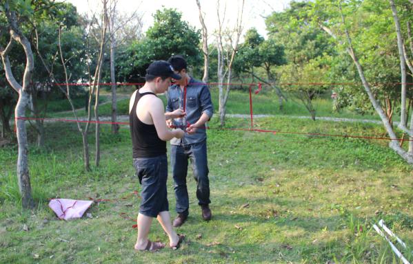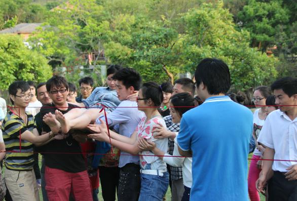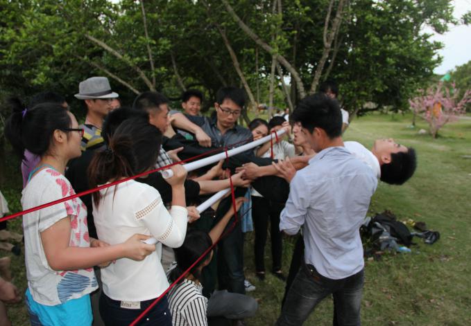 李總親自在準備游戲道具,穿越火線規(guī)則,將隊員從用紅線圈成的逃生圈穿過,人的身體其任何衣物不許碰到線,若碰到線,則過去的人員全部返回重新來過。