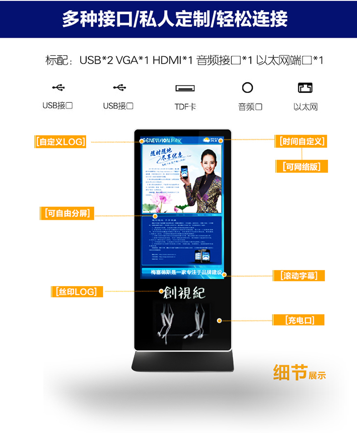 此款機型是一款以手機充電為核心功能,影音廣告播放系統為主,可兼容燈箱廣告的多功能廣告型手機充電站。標配12路充電接口設計可以滿(mǎn)足各類(lèi)客戶(hù)的需求(多路可根據客戶(hù)需求),它已成為體育中心,機場(chǎng),商場(chǎng)、會(huì )議中心、商業(yè)街、加油站的首選。