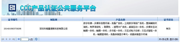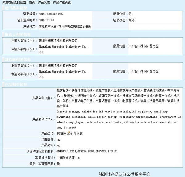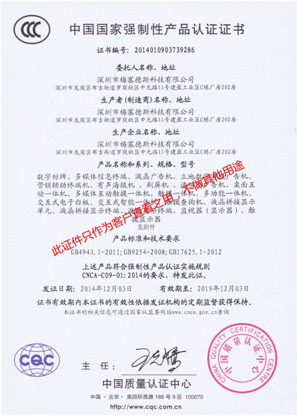 深圳市梅塞德斯科技--創(chuàng)視紀(jì)廣告機(jī)獲得國家3C認(rèn)證